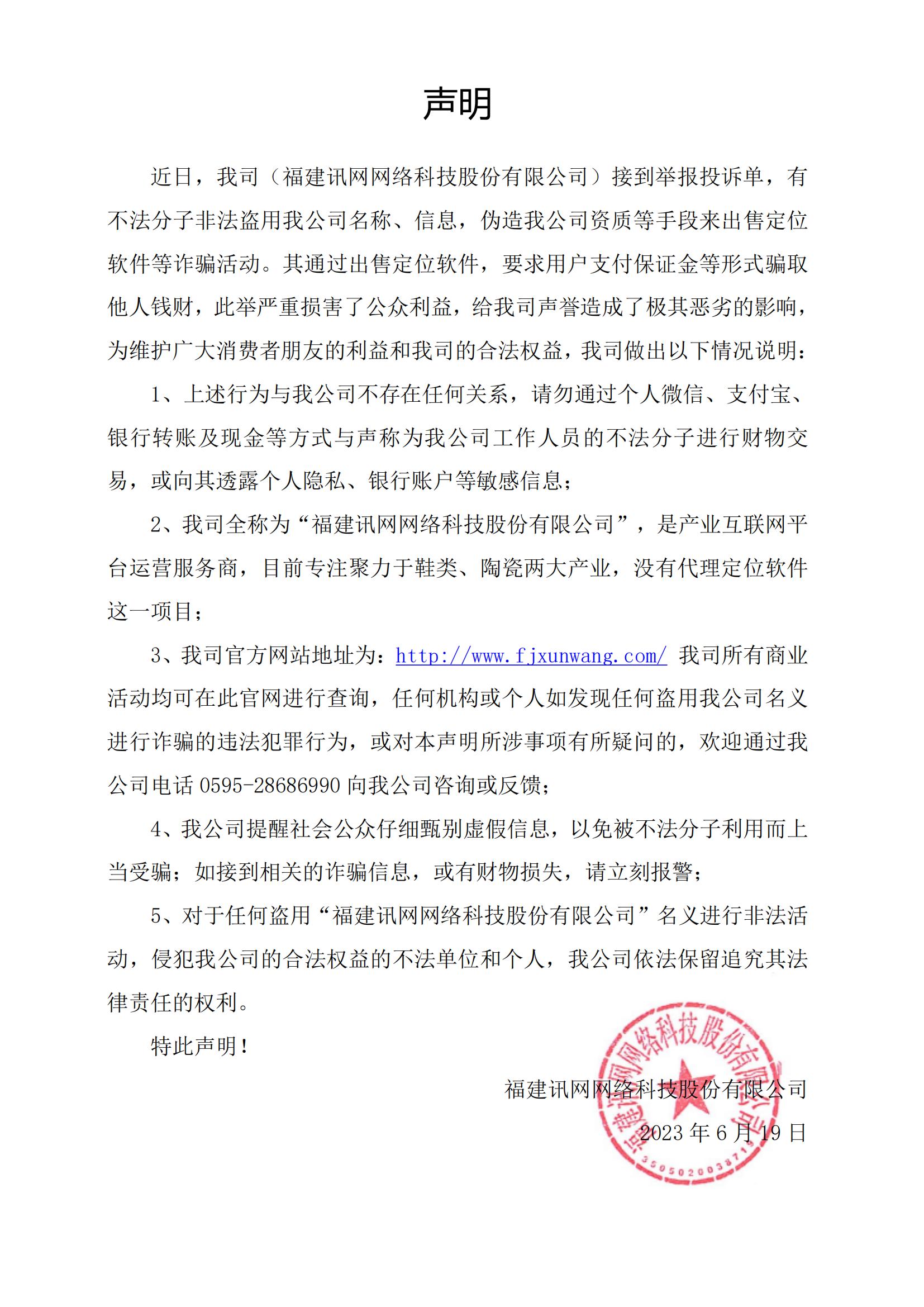 近日,我司(福建訊網(wǎng)網(wǎng)絡(luò)科技股份有限公司)接到舉報(bào)投訴單,有不法分子非法盜用我公司名稱、信息,偽造我公司資質(zhì)等手段來出售定位軟件等詐騙活動。其通過出售定位軟件,要求用戶支付保證金等形式騙取他人錢財(cái),此舉嚴(yán)重?fù)p害了公眾利益,給我司聲譽(yù)造成了極其惡劣的影響,為維護(hù)廣大消費(fèi)者朋友的利益和我司的合法權(quán)益,我司做出以下情況說明: