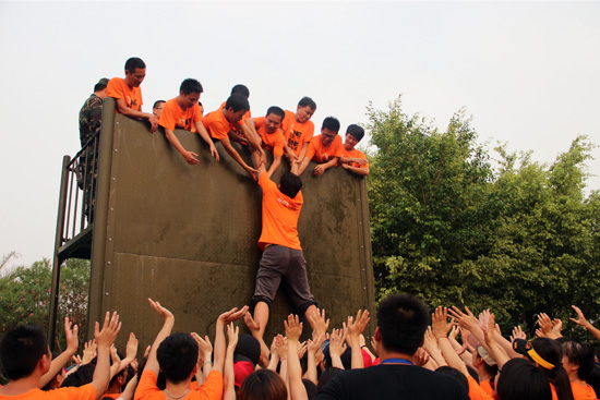 這兩個(gè)項(xiàng)目完成后,我們的大團(tuán)隊(duì)來(lái)到了操場(chǎng),拍了集體照,各個(gè)公司和各個(gè)小隊(duì)也分別拍了照片。隨著留影紀(jì)念結(jié)束,最后一個(gè)項(xiàng)目,也是讓人印象最深刻的一個(gè)項(xiàng)目到來(lái)了。畢業(yè)墻,也叫“夢(mèng)想之墻”。所有人,不能借助任何道具,單純依靠身體的力量,要全部爬上4.7米高的鐵墻。一馬當(dāng)先的隊(duì)員、甘當(dāng)人柱的隊(duì)員、奮力抓取的隊(duì)員、默默守護(hù)的隊(duì)員和幾乎沒有任何可以依靠的最后一名隊(duì)員。每個(gè)人都在這個(gè)項(xiàng)目里找到了自己的角色,并順利地完成了自己的使命。當(dāng)最后一名隊(duì)員——黃永星童鞋爬上了夢(mèng)想墻后,歡呼聲、鼓掌聲頓時(shí)響徹每個(gè)人耳邊。