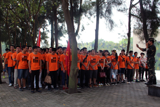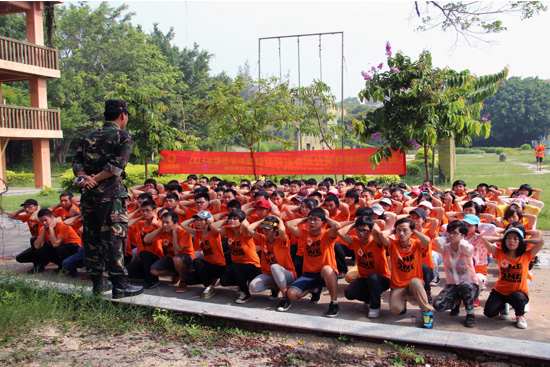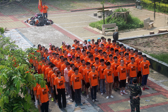 當(dāng)天抵達(dá)大嶝島后,整個(gè)大團(tuán)隊(duì)被分成兩個(gè)連隊(duì):“尖刀連”和“英雄連”,并分成了八個(gè)小隊(duì)。首當(dāng)其沖迎接所有員工的就是教官嚴(yán)格的軍訓(xùn)。一個(gè)口令,一個(gè)動(dòng)作,都必須執(zhí)行到位。一開始團(tuán)隊(duì)因?yàn)椴贿m應(yīng)還帶著點(diǎn)懶懶散散,教官不留情面,直接處罰,命令所有人抱頭蹲地,原地蹬腿。接著又因?yàn)榧贤侠?,全員罰做俯臥撐。經(jīng)過一番雕琢后,我們的大團(tuán)隊(duì)拿出了應(yīng)有的紀(jì)律和氣勢(shì),走入了下一個(gè)環(huán)節(jié)。