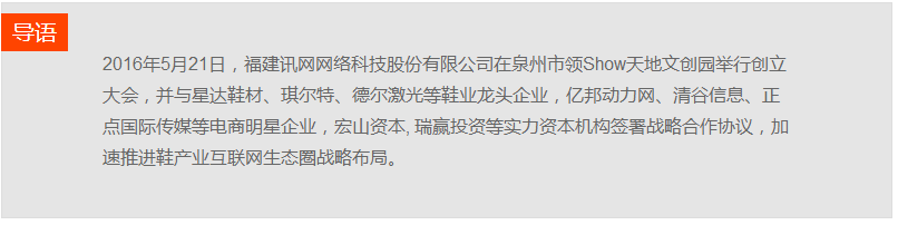 2016年5月21日,福建訊網(wǎng)網(wǎng)絡(luò)科技股份有限公司在泉州市領(lǐng)Show天地文創(chuàng)園舉行創(chuàng)立大會(huì),并與星達(dá)鞋材、琪爾特、德?tīng)柤す獾刃瑯I(yè)龍頭企業(yè),億邦動(dòng)力網(wǎng)、清谷信息、正點(diǎn)國(guó)際傳媒等電商明星企業(yè),宏山資本, 瑞贏投資等實(shí)力資本機(jī)構(gòu)簽署戰(zhàn)略合作協(xié)議,加速推進(jìn)鞋產(chǎn)業(yè)互聯(lián)網(wǎng)生態(tài)圈戰(zhàn)略布局。