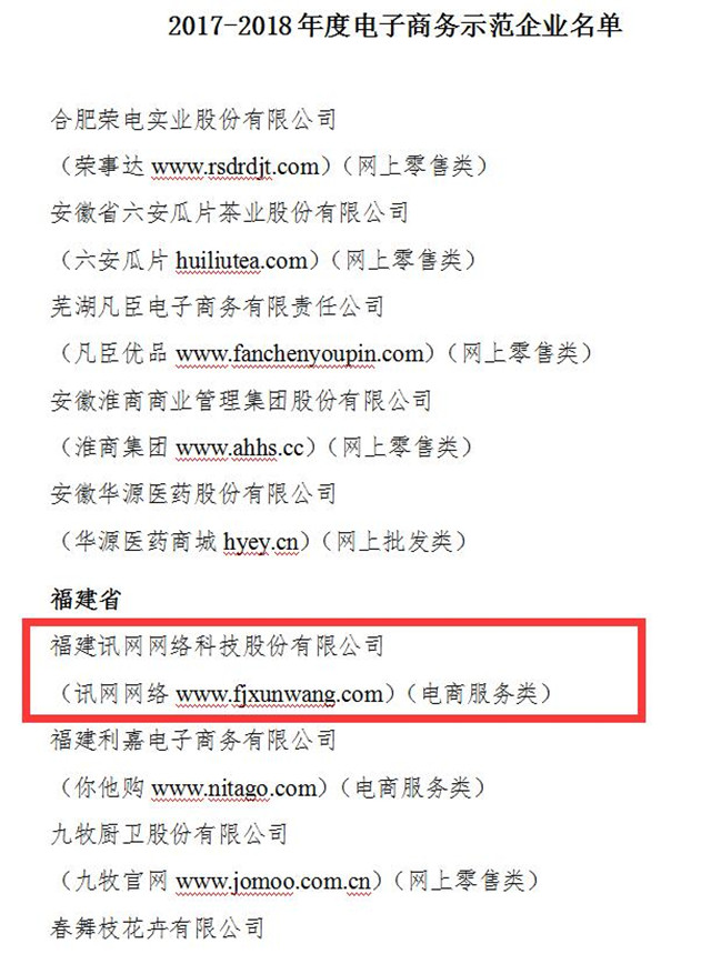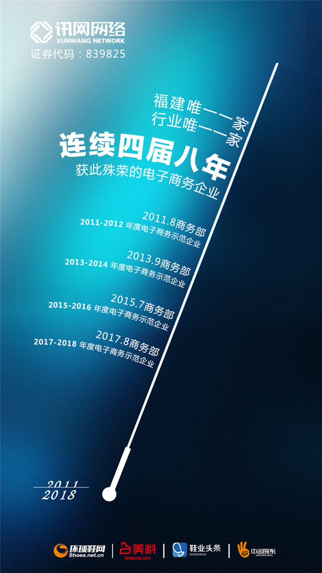 日前,訊網(wǎng)網(wǎng)絡與阿里巴巴、京東、小米等239家知名企業(yè)共同入選國家商務部公布的《2017-2018年度電子商務示范企業(yè)》名單,且成為福建省唯一連續(xù)四次獲得此項國家級重要榮譽的企業(yè)。