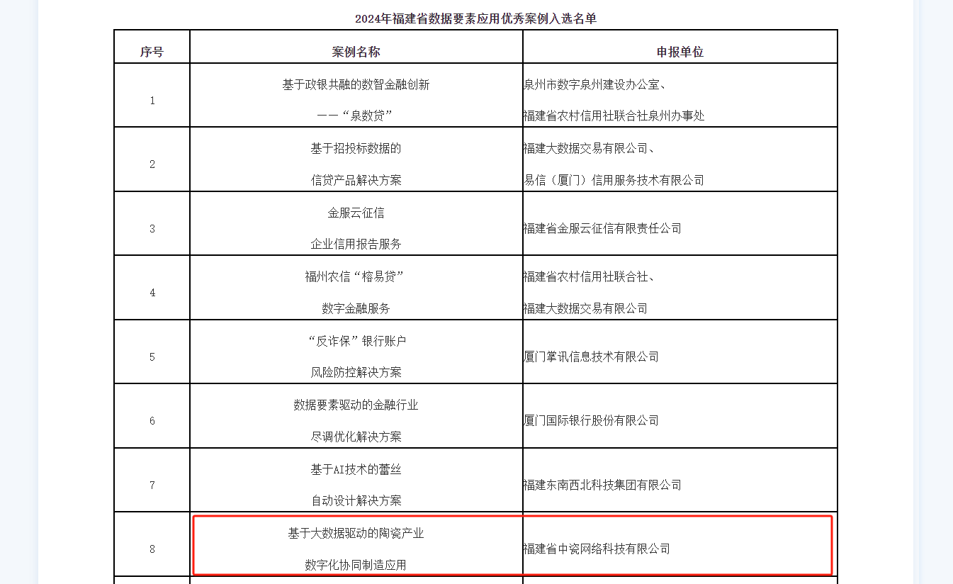 為深入貫徹《“數據要素×”三年行動計劃(2024—2026 年)》文件精神,充分發(fā)揮數據要素乘數效應,賦能經濟社會發(fā)展,日前,福建省數據管理局發(fā)布了2024年數據要素應用優(yōu)秀案例,中瓷網絡“基于大數據驅動的陶瓷產業(yè)數字化協同制造應用”案例成功入選,泉州市唯一一家,祝賀!