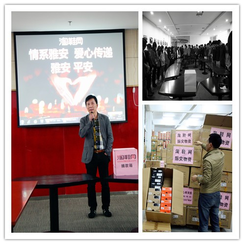 災情發(fā)生后幾個小時,淘鞋網迅速反應,王冬竹董事長立即召集公司全體高管召開緊急大會,指示緊急啟動淘鞋網愛心公益基金支援雅安災區(qū),并第一時間對外承諾向雅安捐贈返回