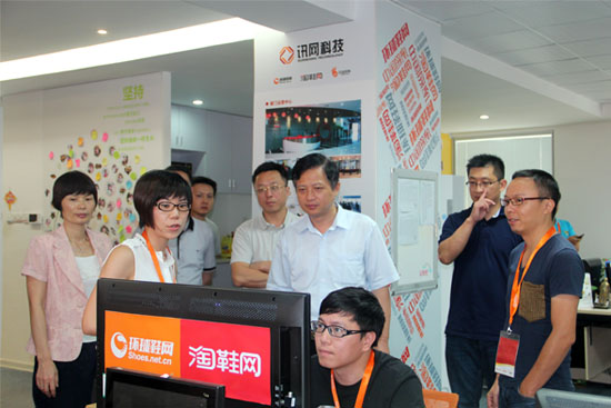 在考察中,賴繼秋副市長通過環(huán)球鞋網(wǎng)、淘鞋網(wǎng)宣傳視頻以及淘鞋網(wǎng)實時銷售展示系統(tǒng)等,充分了解了訊網(wǎng)科技的電子商務(wù)服務(wù)模式。賴繼秋副市長說,龍巖是革命老區(qū),不僅有著深厚的文化歷史底蘊,近些年來的經(jīng)濟發(fā)展也同樣令人矚目。隨著互聯(lián)網(wǎng)時代的到來,龍巖的電子商務(wù)也在發(fā)展,但規(guī)模小,較為零散,沒有形成產(chǎn)業(yè)集群優(yōu)勢和良好的電商氛圍,龍巖林竹、茶業(yè)、薯業(yè)等六大重點產(chǎn)業(yè)和蘭花、漳平水仙、咸酥花生等七大特色產(chǎn)品,仍有很大“走出去”的空間。此次來訪,訊網(wǎng)科技在聚合產(chǎn)業(yè)資源優(yōu)勢,引領(lǐng)傳統(tǒng)鞋企運用電子商務(wù)的模式進行業(yè)務(wù)拓展上取得的成果讓人印象深刻,這種模式值得龍巖借鑒。