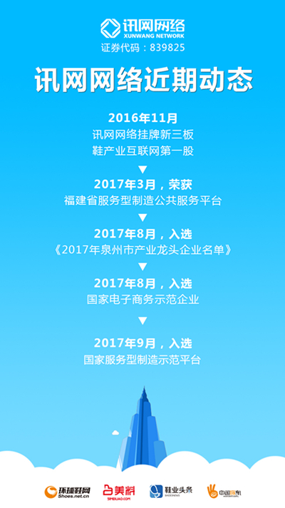 訊網(wǎng)網(wǎng)絡(luò),新三板上市企業(yè),國內(nèi)領(lǐng)先的鞋行業(yè)全鏈條B2B電子商務(wù)平臺(tái)運(yùn)營商,2002年成立。十五年來,始終圍繞鞋業(yè)媒體資訊、鞋產(chǎn)業(yè)B2B平臺(tái)交易、SAAS應(yīng)用三大領(lǐng)域創(chuàng)造性的改變了傳統(tǒng)市場(chǎng),積累了平臺(tái)、用戶、內(nèi)容、技術(shù)、應(yīng)用等深厚的發(fā)展資源,成功打造了“環(huán)球鞋網(wǎng)”、“美料APP”、“鞋業(yè)頭條”、“中國網(wǎng)訊”、“云商鋪”等品牌平臺(tái)。是商務(wù)部電子商務(wù)示范企業(yè)、國家高新技術(shù)企業(yè)、國家服務(wù)型制造示范平臺(tái)等榮譽(yù)稱號(hào)。