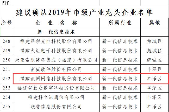 據(jù)泉州市工業(yè)和信息化局發(fā)布的名單公告中,共確認310家企業(yè)為2019年市級產(chǎn)業(yè)龍頭企業(yè),福建訊網(wǎng)網(wǎng)絡科技股份有限公司(以下簡稱“訊網(wǎng)網(wǎng)絡”)入選“新一代信息技術”行業(yè)領域龍頭企業(yè)。