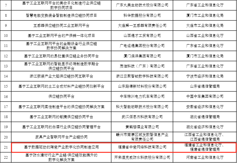 日前,工信部發(fā)布了2023年工業(yè)互聯(lián)網(wǎng)試點(diǎn)示范名單,愛(ài)陶瓷平臺(tái)(中瓷網(wǎng)絡(luò))憑借“基于數(shù)據(jù)驅(qū)動(dòng)的陶瓷產(chǎn)業(yè)數(shù)字化協(xié)同制造應(yīng)用”成功入選工業(yè)互聯(lián)網(wǎng)平臺(tái)+產(chǎn)業(yè)鏈/供應(yīng)鏈協(xié)同試點(diǎn)示范,祝賀!