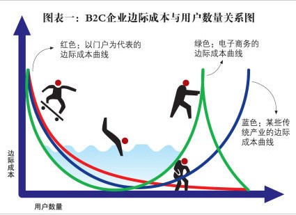 與門戶等互聯(lián)網(wǎng)產(chǎn)業(yè)一樣,B2C產(chǎn)業(yè)特征是典型的邊際成本先下降再上升,然后再下降的反微笑曲線(如下頁圖表所示)。無論是水漲船高的網(wǎng)絡(luò)推廣費用,抑或是讓各家B2C企業(yè)坐如針氈、日益高昂的客戶獲取成本,B2C企業(yè)之爭已經(jīng)從原有的“野蠻式生長”的陣地戰(zhàn),過渡到了今日的“搶人戰(zhàn)”。