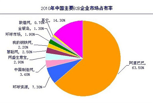 據(jù)中國(guó)電子商務(wù)研究中心即將發(fā)布的《2010年度中國(guó)行業(yè)電子商務(wù)網(wǎng)站調(diào)查報(bào)告》數(shù)據(jù)顯示:2010年,從營(yíng)收規(guī)模上看,綜合類電子商務(wù)服務(wù)商的市場(chǎng)份額排名中,阿里巴巴以63.5%的市場(chǎng)占有率位居第一,環(huán)球資源以7.3%的市場(chǎng)份額排名第二,排在第三的則為焦點(diǎn)科技(中國(guó)制造網(wǎng)),市場(chǎng)份額為3.4%,排在第四的網(wǎng)盛生意寶份額為2.9%,慧聰網(wǎng)則以2.5%的市場(chǎng)份額位列第五,我的鋼鐵網(wǎng)占比2.20%、剩余的份額則被環(huán)球市場(chǎng)、金銀島、敦煌網(wǎng)等其它靠后幾家服務(wù)商所瓜分。